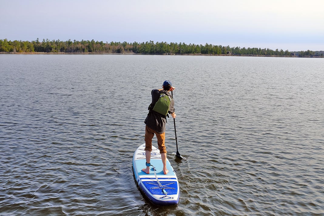 As expected, my first impression was the reassuring stability of the 34-inch-wide board when I launched onto the recently ice-free waters of Lake Huron’s North Channel. Drop stitch construction increases the stiffness and improves the efficiency of the all-around, 10-foot, six-inch board. The modest length of the ISLE means it can’t match the efficiency of a longer touring board—and the cruising speed of this general purpose inflatable SUP will never match that of a hard-shell. However, the Pioneer toured easily enough on a quick lap of the white pine clad, smoothrock islands adjacent to my mom’s place.
