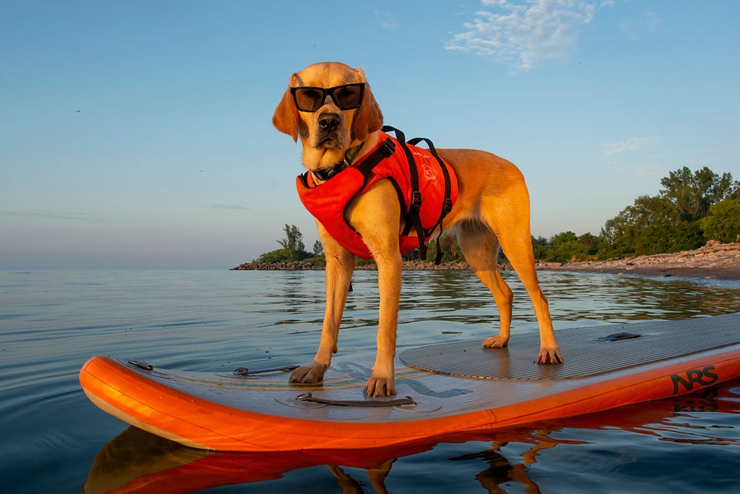 Inflatable boards are convenient for storage and transport and incredibly popular. They’re typically made from a soft but tough PVC material, which provides better traction for a dog’s paws and nails and a softer landing if a dog loses its balance and falls on the board. Hard boards can be made from plastic, wood or composite materials. Their rigidity provides extra stability and increased performance, as there is less bend to the board in waves or when a dog or paddler moves around the deck. Learn more about the pros and cons of inflatable paddleboards and hard boards.